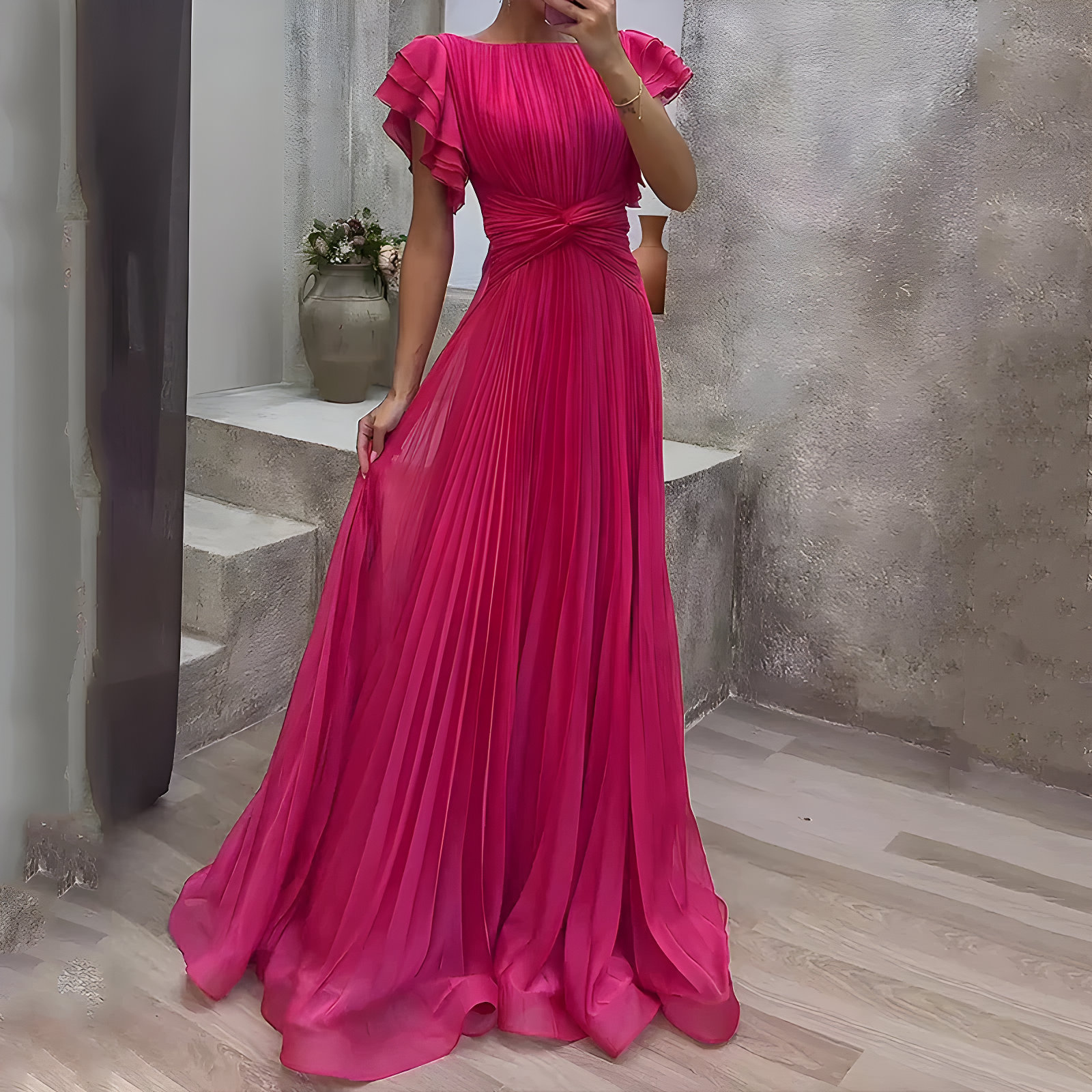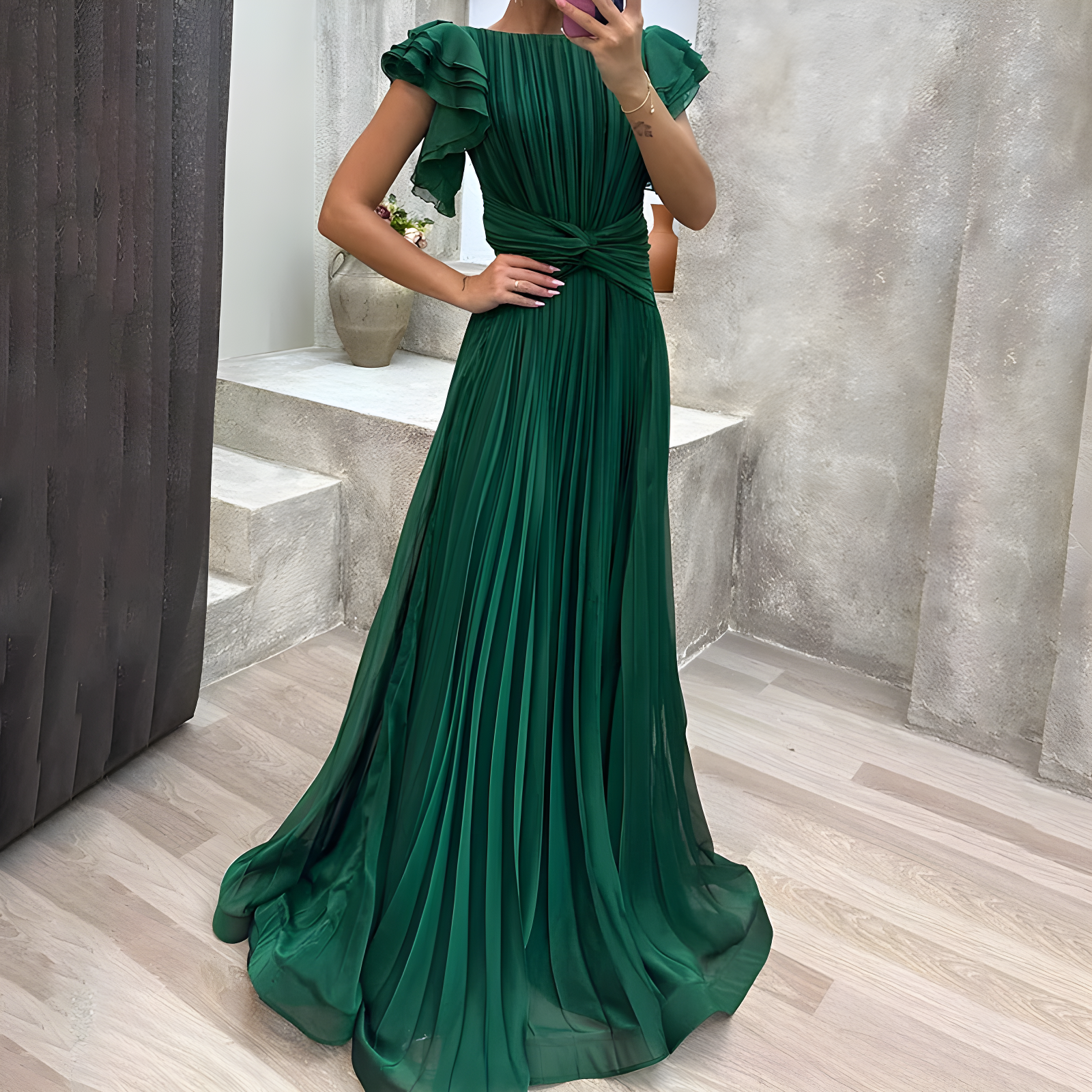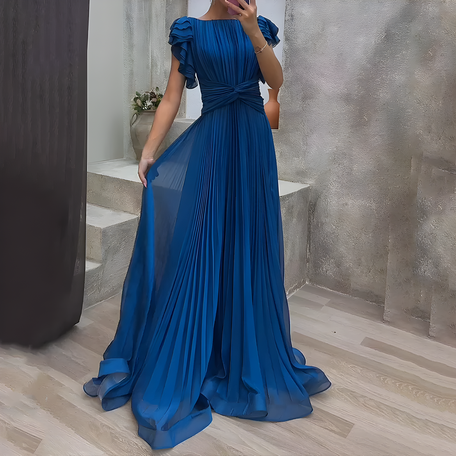 The moment you step into this dress, you feel the shift—your posture lifts, your confidence rises, and every eye is drawn to you. The flowing pleats move with grace, highlighting your figure while giving you the quiet assurance that tonight, you’ll be remembered for all the right reasons.